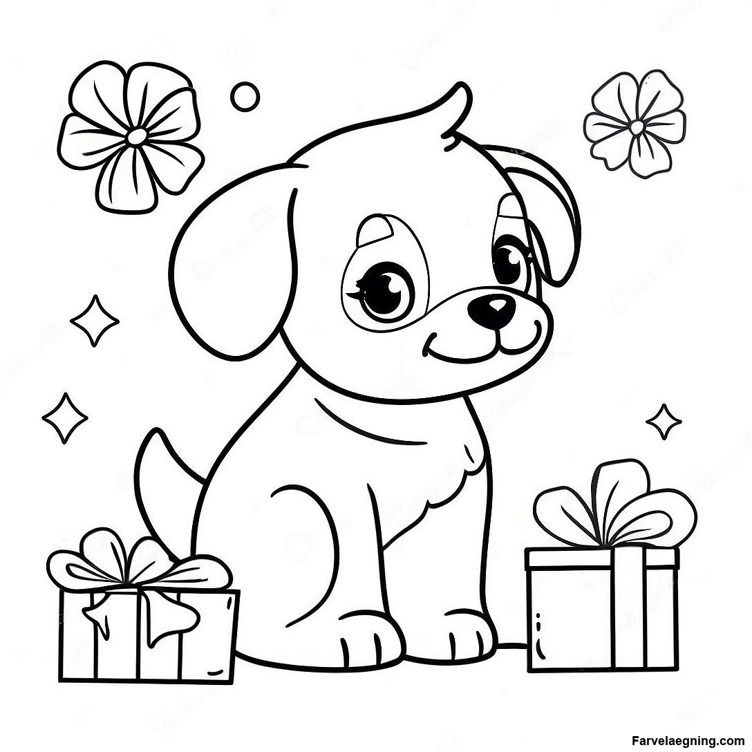 Download printbar PDF af Bedårende Julehund Med Gaver Farvelægningsside