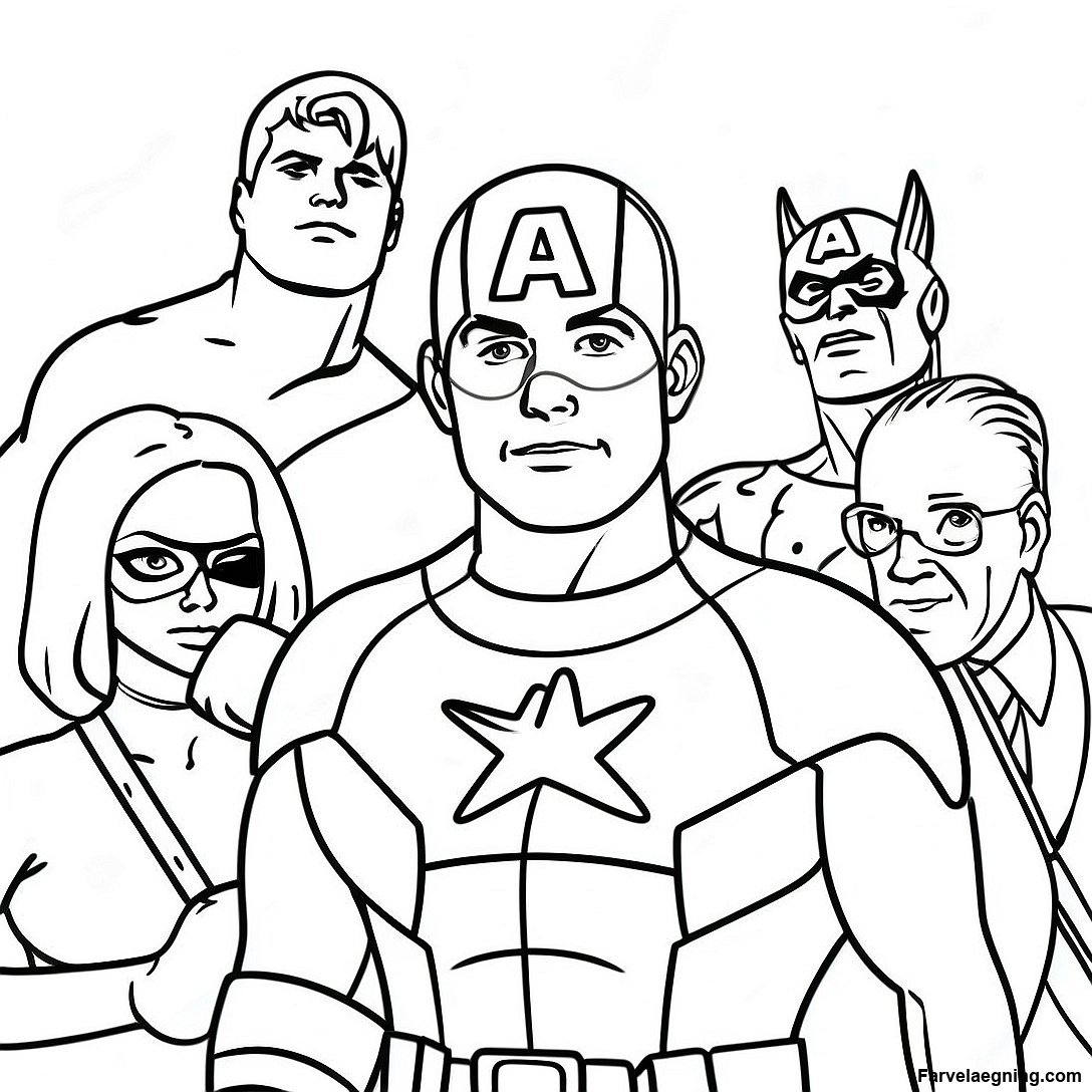 Download printbar PDF af Captain America Med Venner Farvelægningsside
