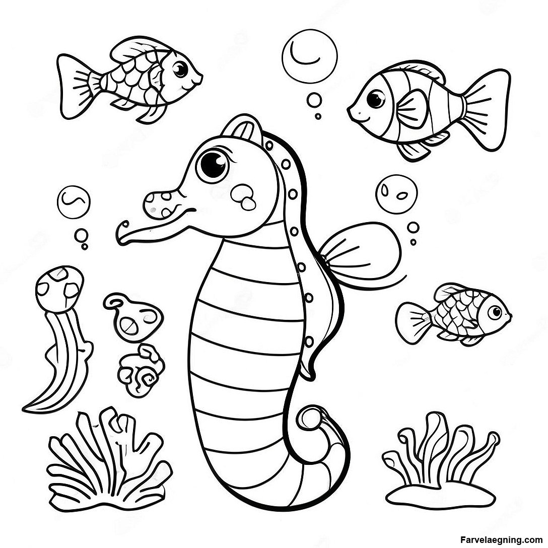 Download printbar PDF af Glad Søhest Med Fisk Venner Farvelægningsside