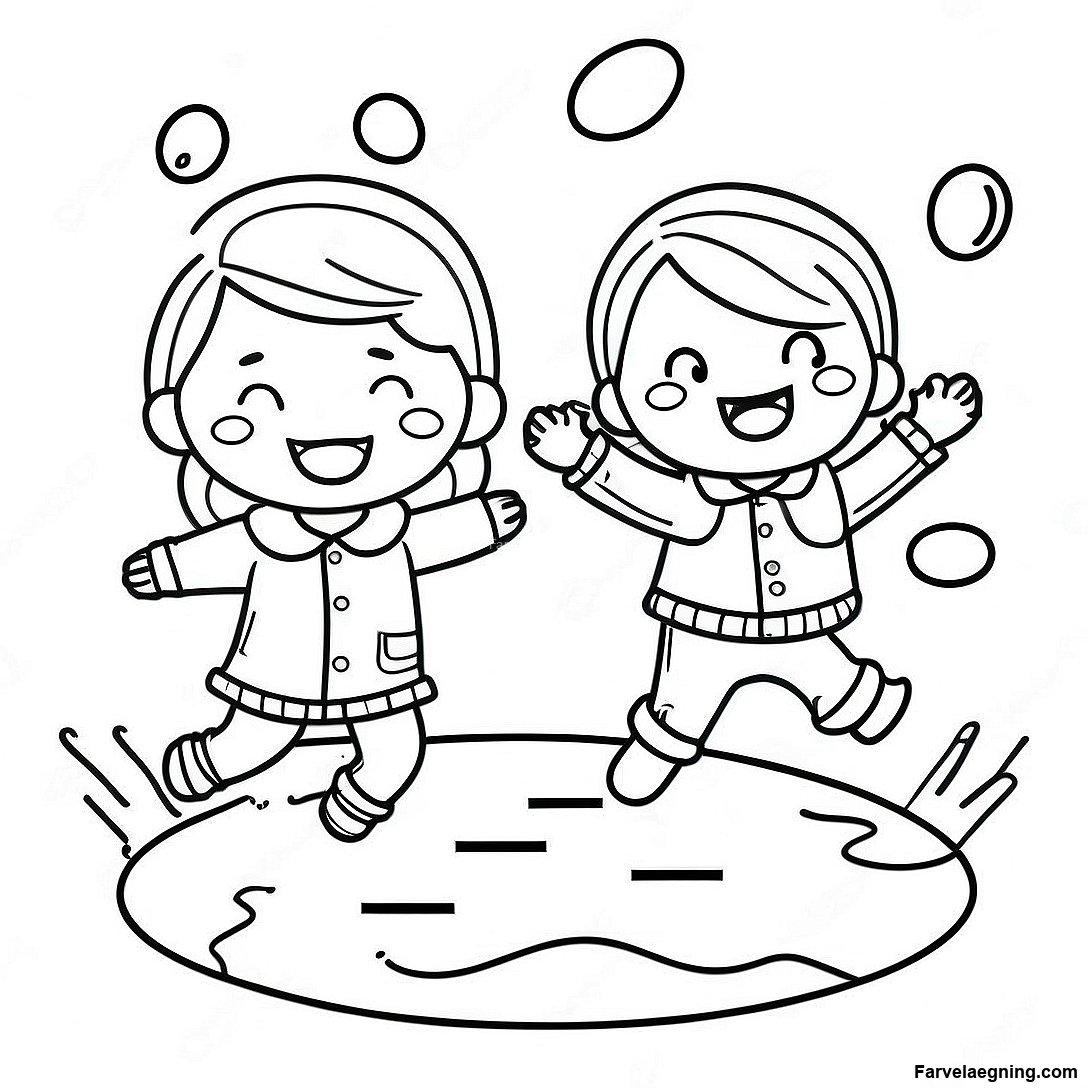 Download printbar PDF af Glade Børn Hopper I Vandpytter Farvelægningsside