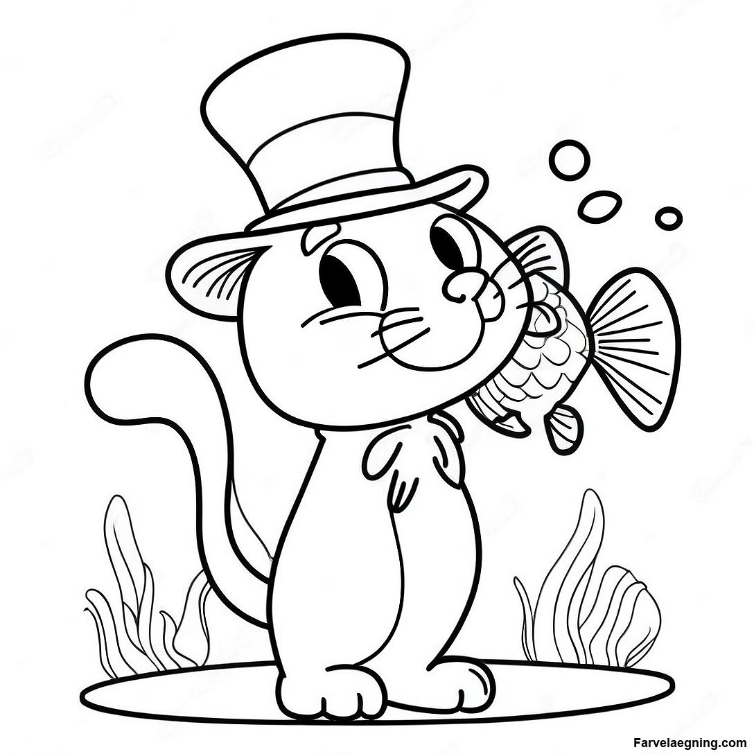 Download printbar PDF af Kat I Hatten Leger Med Fisk Farvelægningssiden