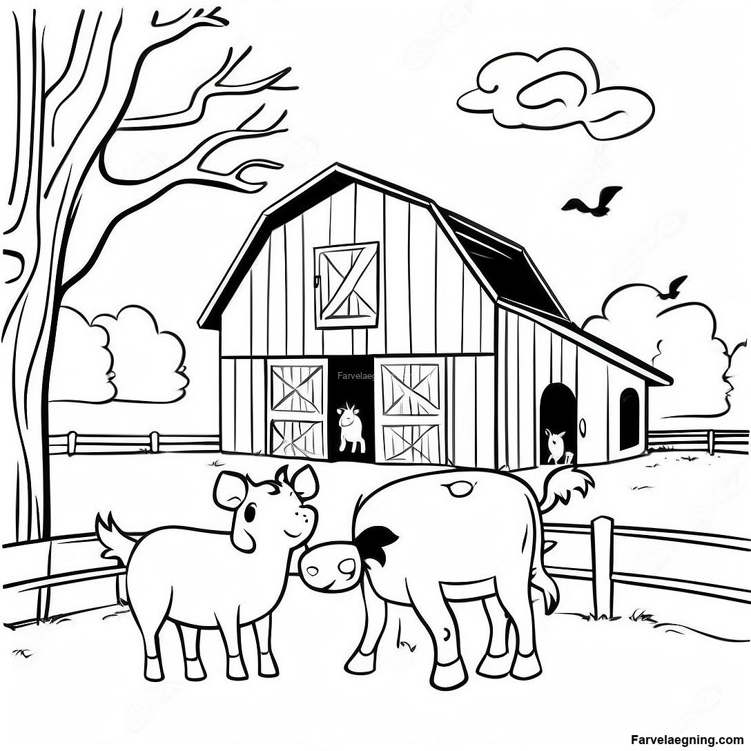 Download printbar PDF af Rustik Lade Med Gårdsdyr Farvelægningsside
