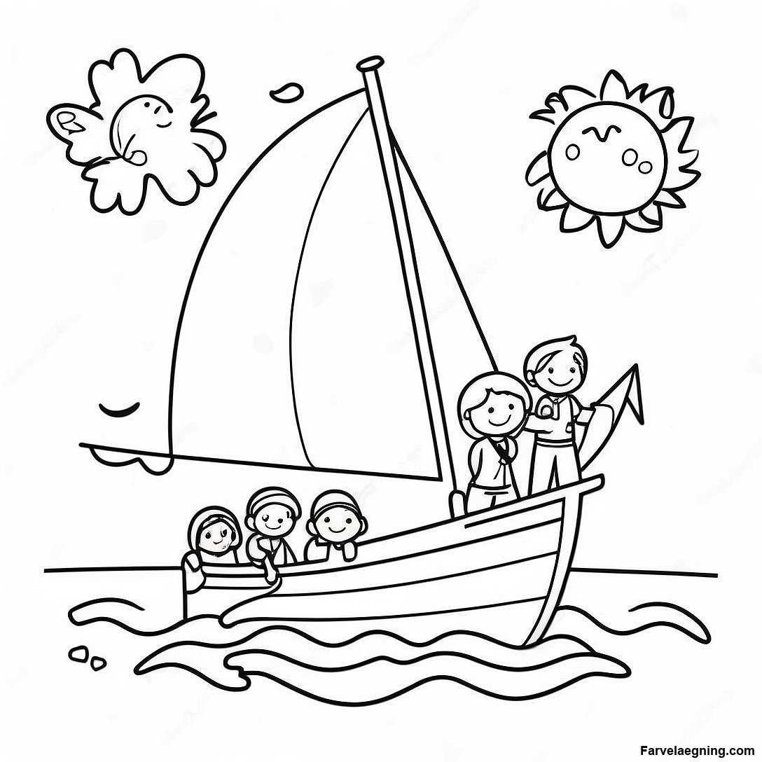 Download printbar PDF af Sejlbåd Med Glade Børn Farvelægningsside