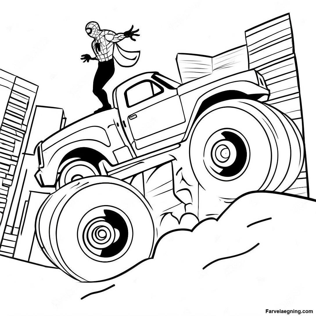 Download printbar PDF af Spiderman Monster Truck Hopper Over Bygninger Farvelægningsside