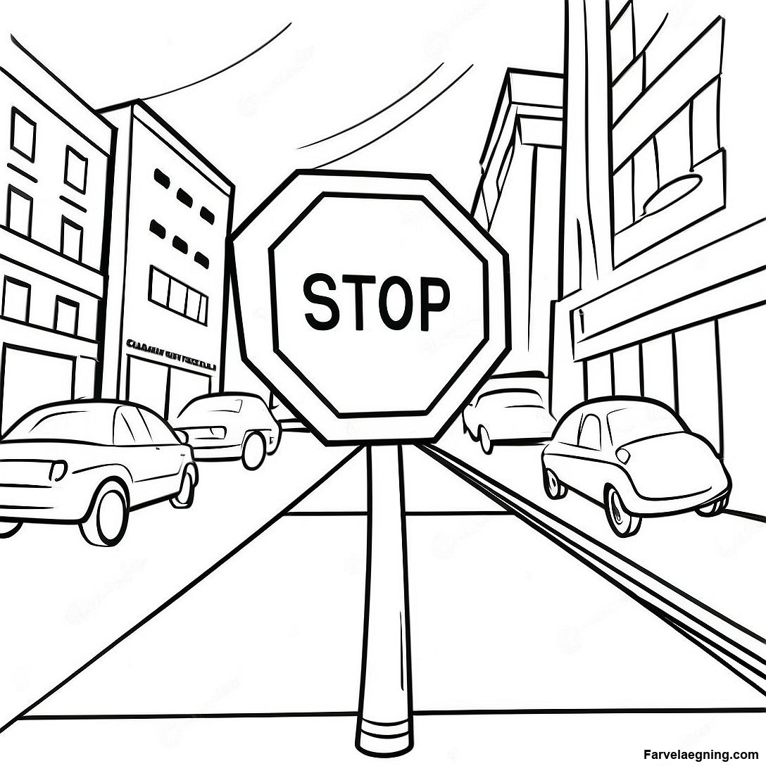Download printbar PDF af Tegneserie Stopskilt I En By Farvelægningsside